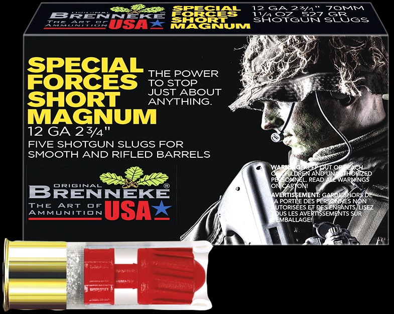 Our Special Forces Short Magnum® (SFSM) was created specifically for urban and CQB situations where the target is concealed behind a wall, a door, in a vehicle, or similar barrier. It provides superb penetration—through 34.9″ of FBI-spec ballistic gelatin—to put an immediate end to the threat. Its massive frontal area, specially tailored hard alloys, and distinctive Brenneke weight-forward design will penetrate most commonly encountered urban barriers, including many vehicles, with little deformation or loss of weight. This means that almost all of its devastating power is delivered to the target. The SFSM’s red coating reduces barrel fouling, too. When a bad guy thinks he’s safe, the SFSM will prove that he’s not.
